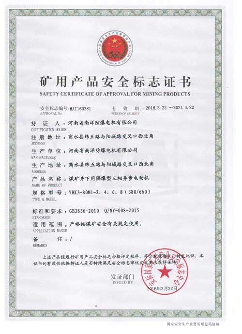 本系列電動(dòng)機(jī)符合 GB755-2008《旋轉(zhuǎn)電機(jī)定額和性能》、企業(yè)標(biāo)準(zhǔn)Q/320206JLAB88-2010《YBK3系列煤礦并下用隔爆硯三相異步電動(dòng)機(jī)技術(shù)條件(機(jī)座號(hào)H100-355)》。其防爆性能符合BG3836.1-2010《爆炸性環(huán)境第1部分:設(shè)備通用要求》和GB3826.2-2010《爆炸性環(huán)境第2部分:由隔爆外殼"d"保護(hù)的設(shè)備》、也符合MT451一l995《煤礦用隔爆型低壓三相異步電動(dòng)機(jī)安全性 能通用技術(shù)規(guī)范》的規(guī)定,制成隔爆科ExdI適用于煤礦井下爆炸性氣體環(huán)境的危險(xiǎn)場(chǎng)所。也符合IEC79-1,BS4683和EN50018的規(guī)定,制成隔爆型。防爆標(biāo)識(shí)為ExdI Mb,使用有爆炸性氣體混合物存在的場(chǎng)所。ExdI Mb適用于煤礦采掘工作面具有甲烷或煤塵的爆炸性混合物存在的工作環(huán)境。